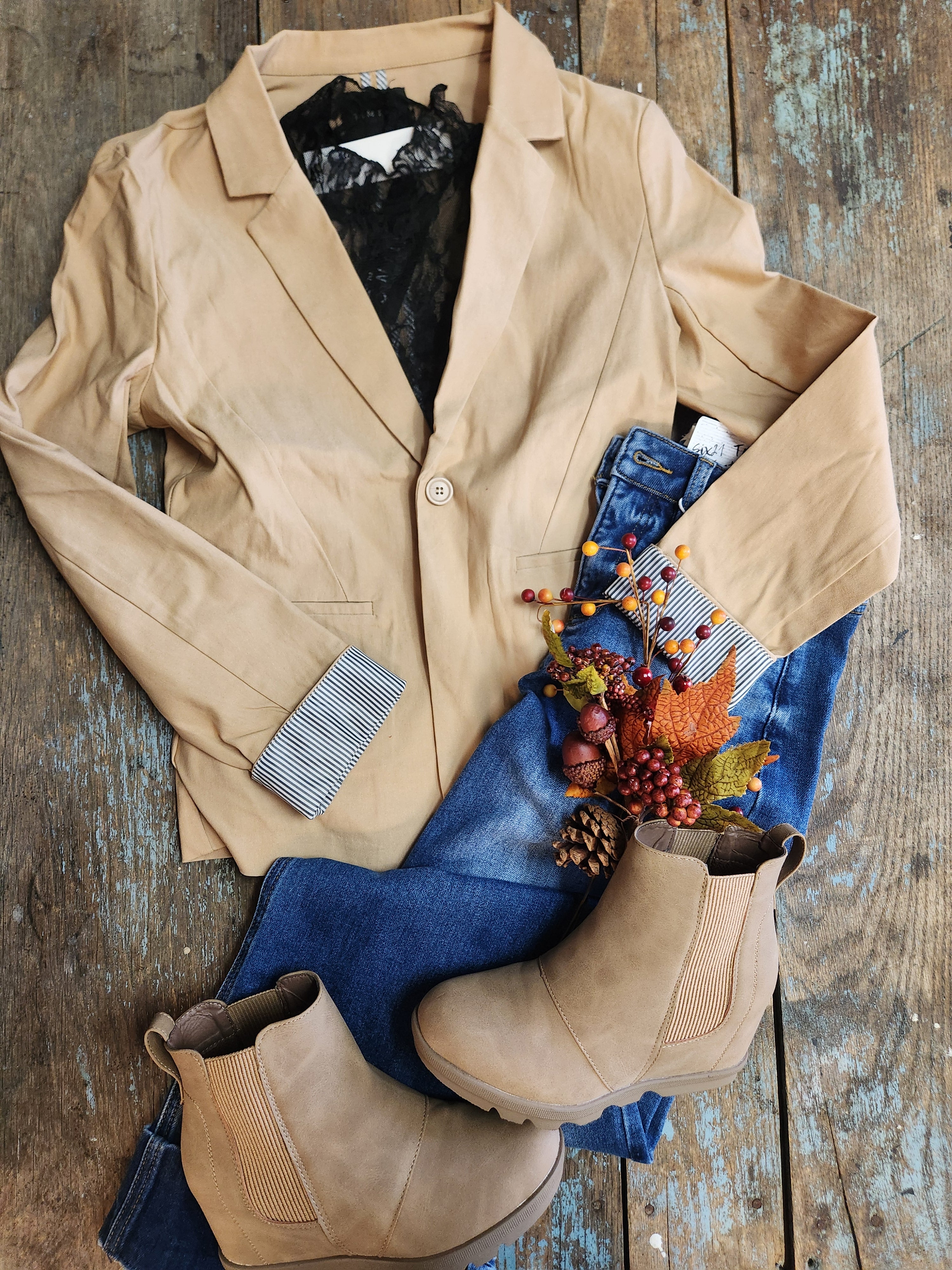 Long sleeve open front knit blazer with stripe cuff and front pocket