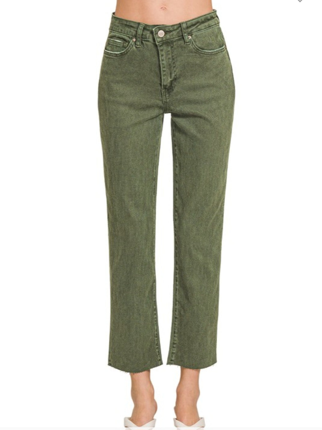Zenana Acid Washed High Waist Cropped Straight (Dark Olive)