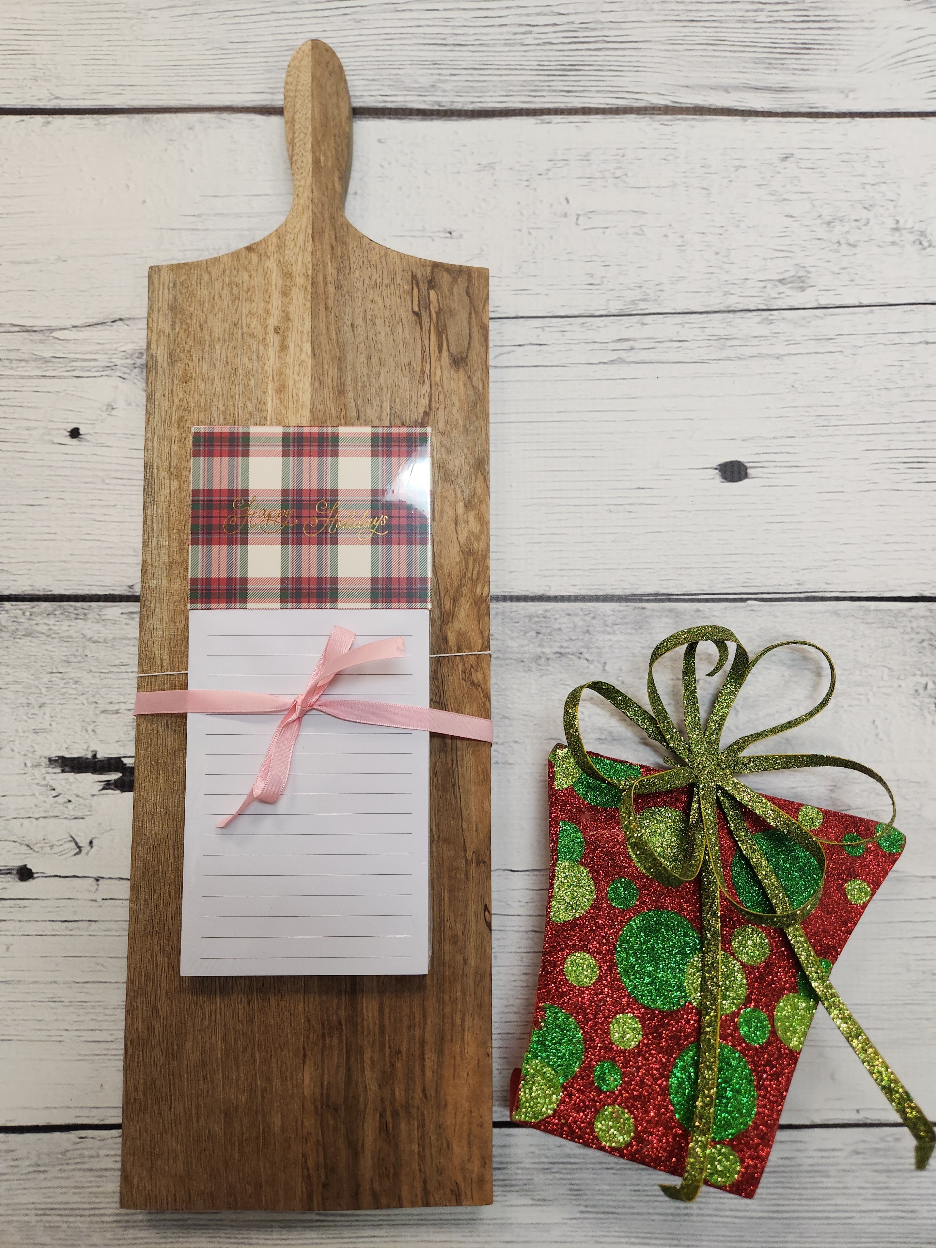 The perfect gift for many! A Charcuterie board + a magnetic happy holidays Notepad. Add more to it such as a pot holder, bag of candy or gift as is.