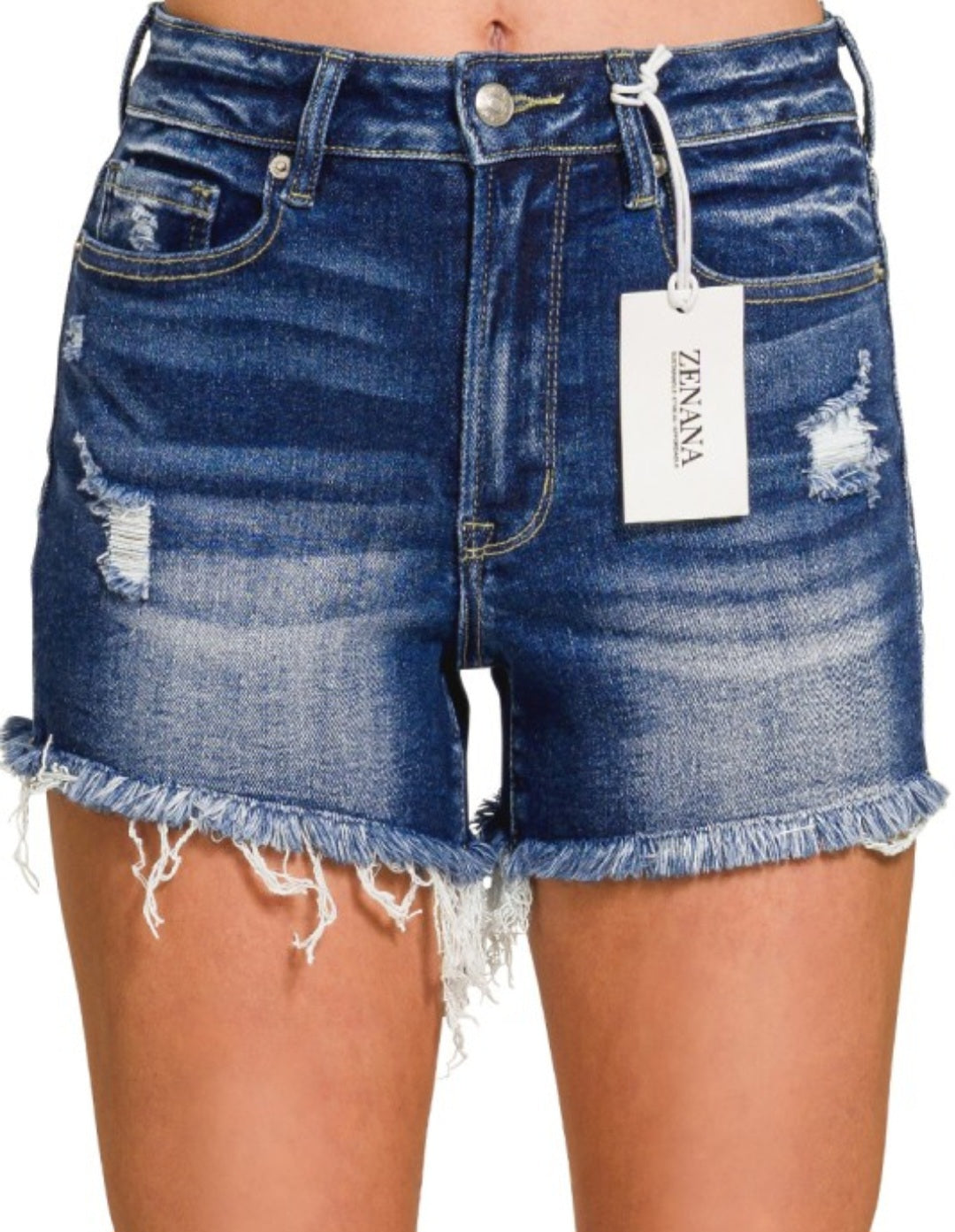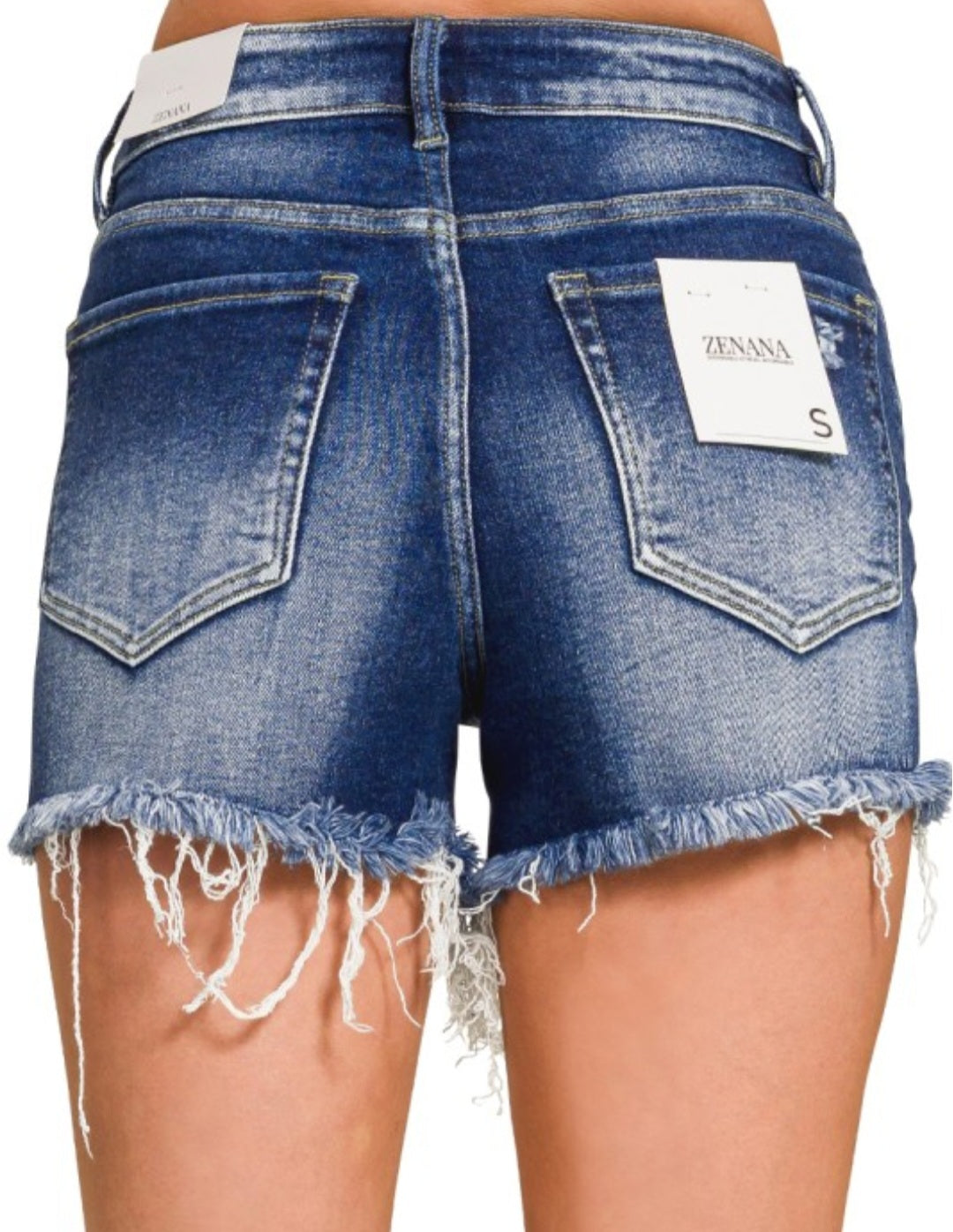 Zenana Dark Wash Raw Frayed Hem Denim Shorts